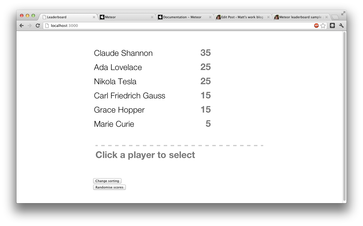 The meteor sample already has a formula to generate a random score which is called on startup if the database is empty. So let’s refactor that into a function so that we can reuse it.