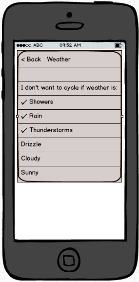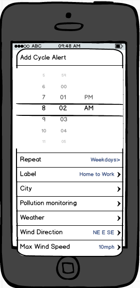 In the meantime I started thinking about what the UI for a first version of Should I cycle could look like, and came up with these mockups (using Balsamiq). As you can see I’ve taken iOS’s Alarm app as inspiration and copied much of its UI.