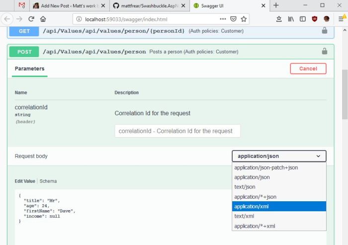 Now you’ll need to consume version 5.0.0-beta or later of my Swashbuckle.AspNetCore.Filters NuGet package. Follow the instructions and implement IExamplesProvider<T>. Then when you choose application/xml in the request or response select list, you’ll see the example in XML format: