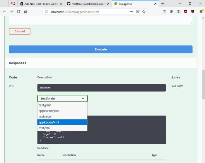 A few years ago I blogged about how to add Swagger examples for requests and responses. But those examples are rendered in JSON. What if your application supports XML, wouldn’t it be nice to see the examples in XML too? Let me show you how to set that up (in .NET Core).