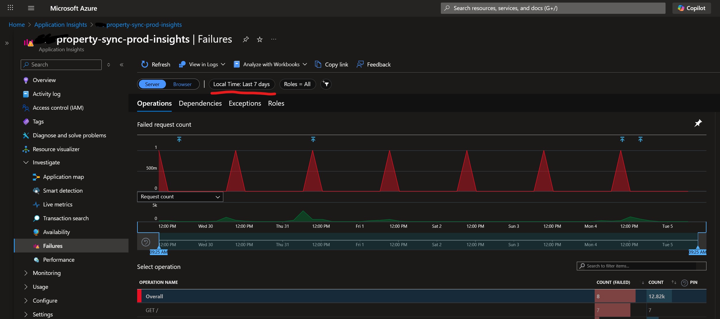 Every day at around the same time, something mysterious (which doesn’t belong to us) pings all of their Azure API Management instances at site root, i.e. GET /. We don’t know what it is, but I guess it’s something to do with Azure Monitoring or infrastructure, or a keep alive or something. Our APIM doesn’t have anything at site root /, so it returns a 404. This 404 is counted as an Exception which is logged as a regular Failure in Application Insights: