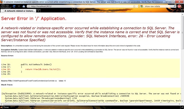 I’ve been playing around some more with EF code first. Today’s task was to try to get it to work with a .mdf file located in the App_Data folder of the web project.