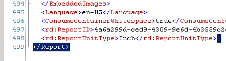 When I opened the rdl it looked fine, and when I viewed the source of it in Visual Studio it also looked fine. But the telltale sign was that I could not delete the last character in the .rdl file, a ‘>’ which closed off the final </Report> tag. In the end the fix was quite simple, all I did was delete that last </Report> tag and type it in again.